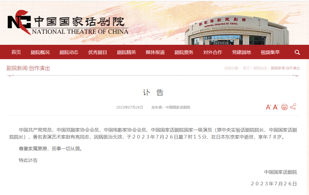 中国共产党党员、中国戏剧家协会会员、中国电影家协会会员、中国国家话剧院国家一级演员(原中央实验话剧院院长、中国国家话剧院院长)、著名表演艺术家赵有亮同志,因病医治无效,于2023年7月26日晨7时15分,在日本东京家中逝世,享年78岁。